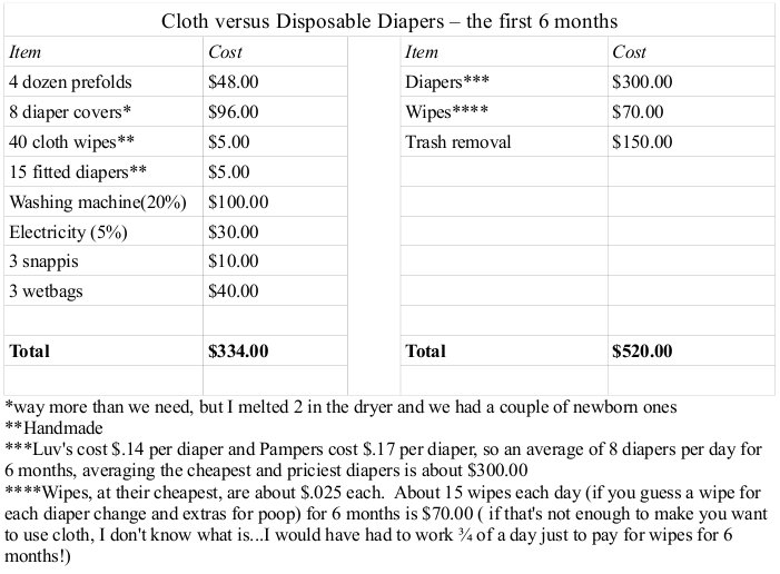 2. I’m with you, Elizabeth! I was thinking about ease and about daddy and babysitter’s happiness when I went with more expensive diapers. We went for the pockets, AIOs, and onesize diapers, but I may be game to try prefolds with the next kid. Just think, this savings is only for 6 months of use! Justin and I think we can save over $1000 using cloth with Morgan (birth through potty training).