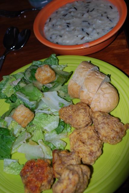Wild mushroom soup (from a dried mix someone gave us), Caesar salad, sausage balls, and bread. My photography skills seem to go from creative to boring based on how hungry we are by the time dinner gets done.