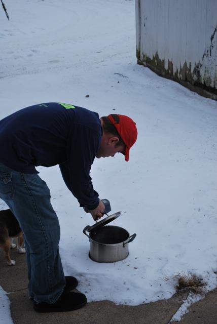 While Meg was staying at her grandparents house in Hannibal, Brooke and I took it upon ourselves to brew not one, but two, beers in a single day. From start to finish, the entire process took almost 10 hours, but most of that time was spent cooling down the “wort” (i.e. unfermented beer). I think we’ll need to invest in a wort chiller, as my chosen method of cooling the pots from boiling down to ~70 F, involving placing the pot outside in the snow, didn’t really speed things up in the least.