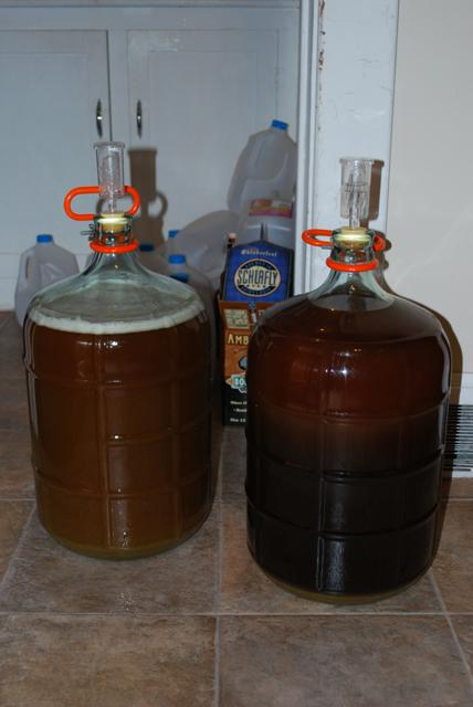 Another change this time around involved brewing the beer in glass carboys, borrowed from my Dad who used to use them for brewing wine. There are advantages and disadvantages to using these things. One advantage is that they’re glass, so you can see through them to view how your brewing process is going. Also, being glass, it is less likely that after years of use, you’ll have residual flavors being imparted by your fermentation vessel, as plastic can do (but really won’t for quite a long time).