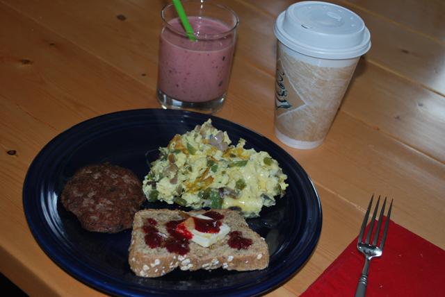 Breakfast Saturday morning was eggs with peppers and onions, toast, sausage, and peach-berry smoothies. Andy and his mom went to Kava House and grabbed coffee for themselves and chai for me. A good start to our day!!