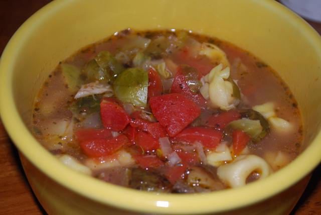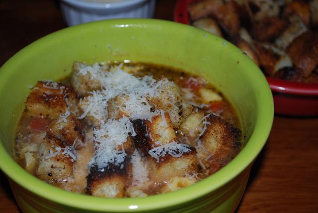 I used up some of the leftovers from our weekend meals to make some Italian-ish soup, along with stale bread for croutons. The first picture is the way I ate my soup and the second, more boring, picture is the way Andy ate his.