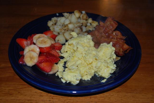 This one was scrambled eggs, bacon, fried potatoes, and strawberries and bananas. Does anyone else sing Gwen Stefani when they type B-A-N-A-N-A-S?