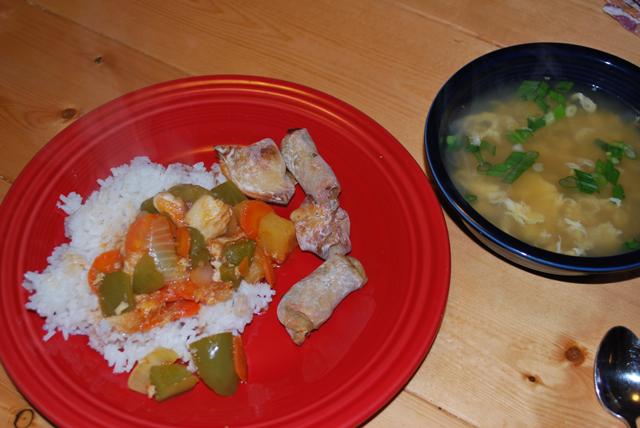 We had company Saturday night. I had originally planned homemade pizzas, but one of our guests just had her wisdom teeth taken out, so I made Chinese so she could have soup. This was sweet and sour chicken, tiny egg rolls and crab rangoon, and egg drop soup.