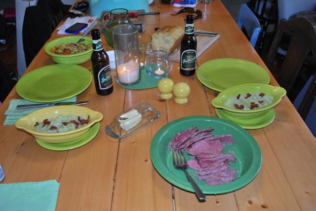 For the past 5 years, we’ve attended Dr. Westfall’s St. Patrick’s Day celebration in St. Louis, with dancers, food, and lots of beer. Since we’re not there any more, I decided to make an Irish-ish dinner to celebrate the “holiday.” Corned beef, roasted potatoes with carrots and onions, cabbage, and soda bread. And Smithwick’s beer. We had mint chocolate chip ice cream for dessert-while not exactly Irish, it is super green!