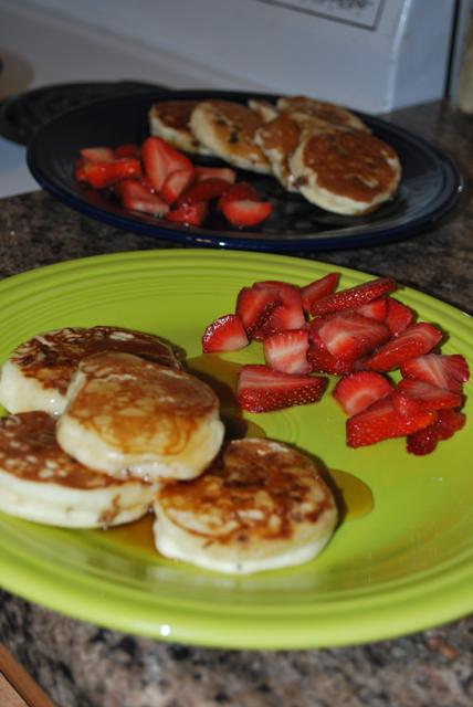 We didn’t have to play at church this week, so we had time for a leisurely breakfast. Pancakes with granola, and strawberries that weren’t quite ripe, so I softened them up with a tablespoon of sugar and a drizzle of orange juice.