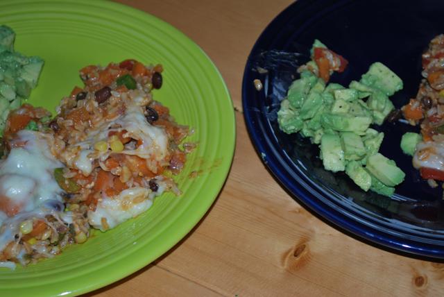 Southwest casserole, a la Brooke T. and avocado. For once, Meg actually downed her share of the avocado. Guess this means we’ll have to get it more often if she likes it!