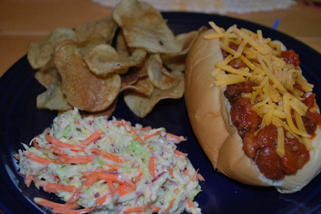 Chili dogs with leftover chili, homemade potato chips (that I sacrificed my thumb for), and coleslaw to use up some of the accidentally bought cabbage.