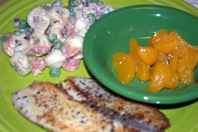 Even after several years of a photography project in 4-H, my picture taking skills are still lacking. I was always better at composition and not the technical aspects. This dinner was tilapia, pasta salad, and oranges. I had planned to grill the fish, but the weather didn’t cooperate, so it was pan-fried instead.