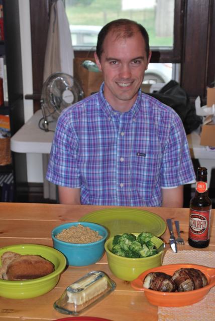 Andy’s birthday dinner. I didn’t think it was going well while I was making it (huge flames shooting out of the bottom of the grill didn’t seem like a good sign), but it ended up pretty good! Chicken “grillers” with red peppers and mozzarella cheese, cous cous and quinoa, broccoli, and beer bread made with our mild ale.