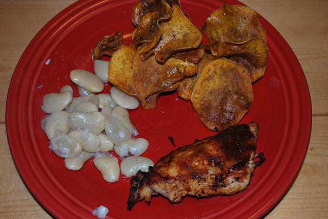 Grilled chicken, butter beans, and sweet potato chips.