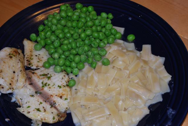 Posted on July 12, 2011 by brooke06.28.11 Dinner Again, I’m behind on Dinner posts. This one was tilapia, peas, and noodles from a packet. I got a little impatient with the noodles, so they were a tad crunchy. Oh well.