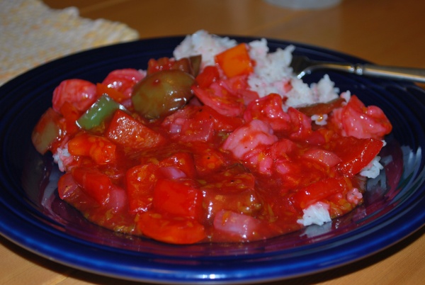 Too-red sweet and sour shrimp. I didn’t taste as red as it looked, but the leftovers still scared me, so I’m pretty sure they’re still in our fridge. Oops…