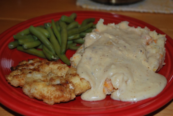 Fried chicken, fresh green beans, and mashed potatoes and gravy. The potatoes were sort of polka dotted since I threw in a yam to give them a little nutritional value since Meg has decided mashed potatoes are her favorite food!