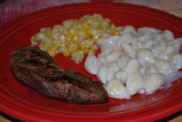 Posted on August 17, 2011 by brooke08.12.11 Dinner Since I’m only home to cook a couple of nights a week now, I try to pack a lot into those meals! This one was fresh corn casserole (a little chewy, though), shells and cheese, and steak.