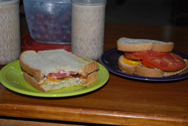 Fried egg sandwiches (eggs from our chicken who has been chowing down in the compost pile a lot recently, making her egg yolks even more yellow) with fresh, homegrown tomatoes, turkey bacon, and cheddar cheese. Also, chocolate-banana “smoothies.”