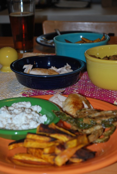 Posted on September 21, 2011 by brooke09.16.11 Dinner Roasted chicken (the precooked kind…they were on sale!), baked sweet potato fries, green pepper rings. The peppers were a last minute inspiration, but I think they turned out well. Kind of tasted like fried okra.