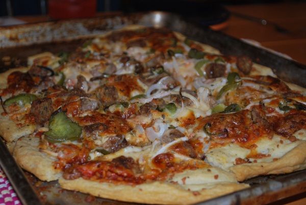 Pizza with peppers (from our Iowa garden!), onion, and meatballs. I really had enough crust for two pizzas, but I wanted to get it out of the fridge, so I had to prebake it for a few minutes before adding the toppings.