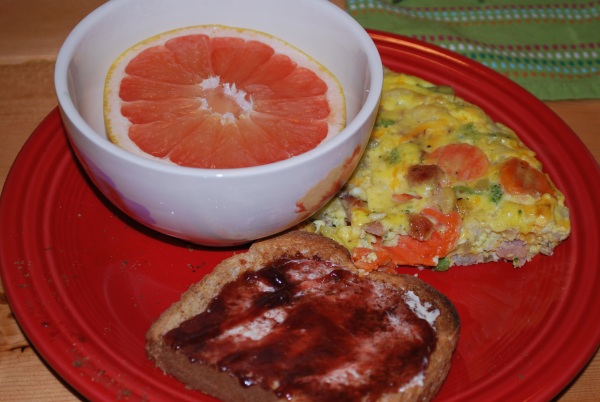 Ham and veggie frittata, toast with homemade grape jelly, and grapefruit. January’s meal plan called for several soups, but it’s been so warm that we’re improvising with some of the soup ingredients to have warmer weather meals, because who wants soup when it’s 70 degrees outside??