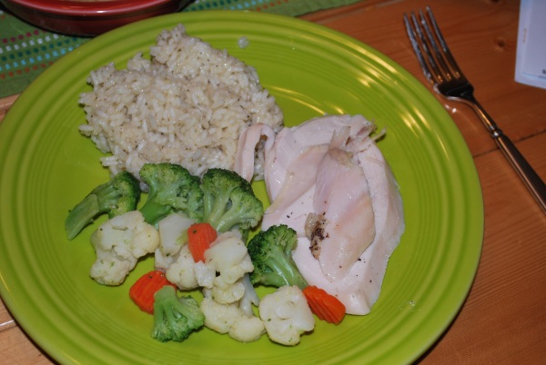 Posted on January 26, 2012 by brooke01.23.12 Dinner Roast chicken, rice, and California blend vegetables. I don’t know why I don’t roast a chicken more often. Less than $5 for at least 4 meals and not a ton of effort.