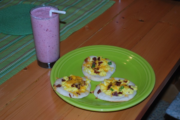Mini breakfast pizzas on whammy biscuits and orange-berry smoothies.