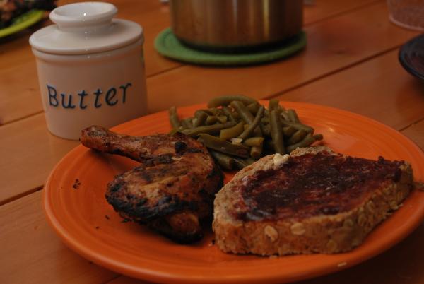 Posted on March 27, 2012 by brooke03.25.12 Dinner After a Sunday afternoon of working outside, we had grilled chicken, green beans from last summer’s garden, and homemade bread. Note the new butter crock – no refrigeration required, so the butter stays spreadable!