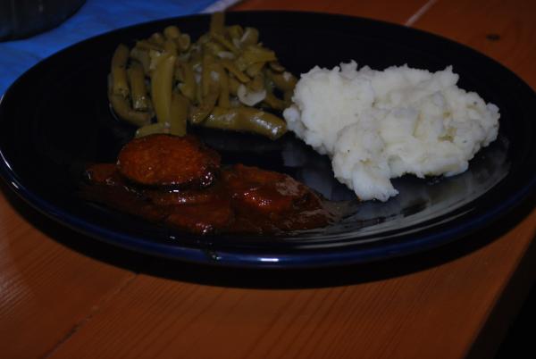 Posted on March 29, 2012 by brooke03.26.12 Dinner Used up some leftovers for this one: Barbecued cherry sausage, blue cheese mashed potatoes, and green beans.