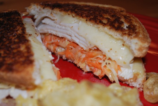 I had been planning this dinner for nearly a week before we got around to it: grilled turkey and swiss with carrot slaw. I think I had something sort of similar at a restaurant once that was better than this, but was probably a lot more complicated to make.