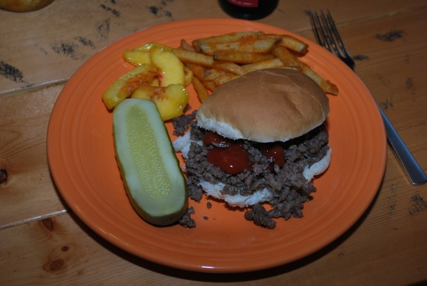 We generally have take out or something else quick on Friday nights, but Meg was sick and home from day care this week, so our plans were impeded a little. So, maidrites, fries, huge pickles, and peaches it was!