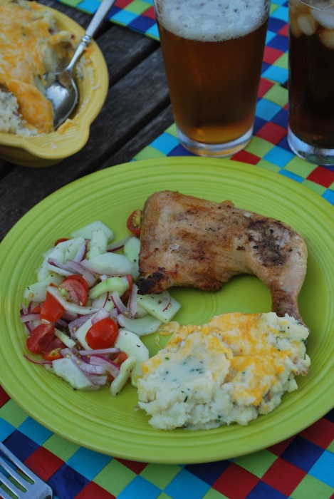 Finally a break in the heat so we could eat outside again! Grilled chicken leg quarters, mashed potato casserole, cucumber and tomato salad(from our garden!), and a growler of beer from The Civil Life.