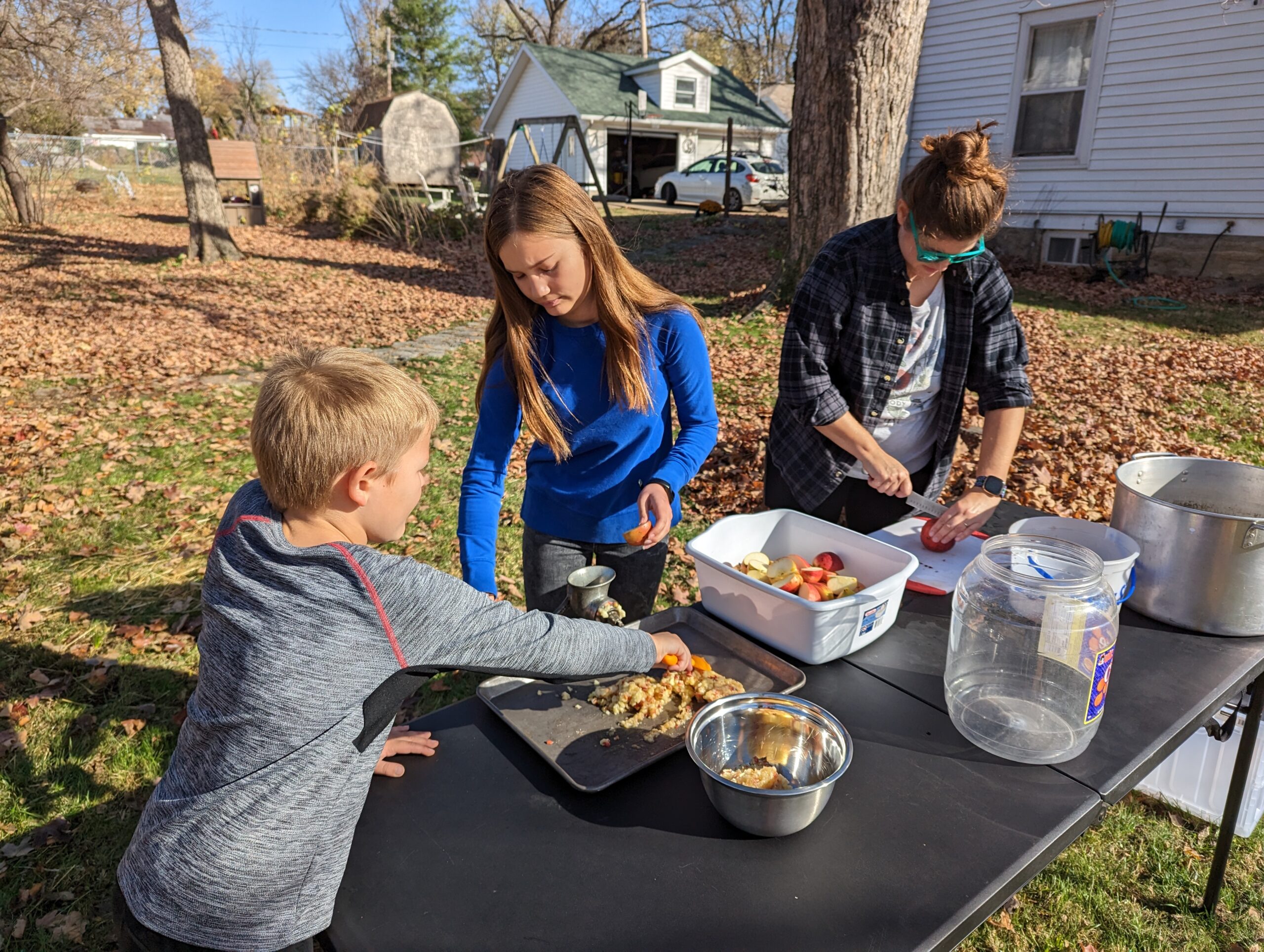 This time, Brooke used a meat grinder to crush the apples before we put them in the press. She quartered them and Meg put them through the grinder, with Calvin scraping them across the cookie sheet toward a bowl for transfer to the press.