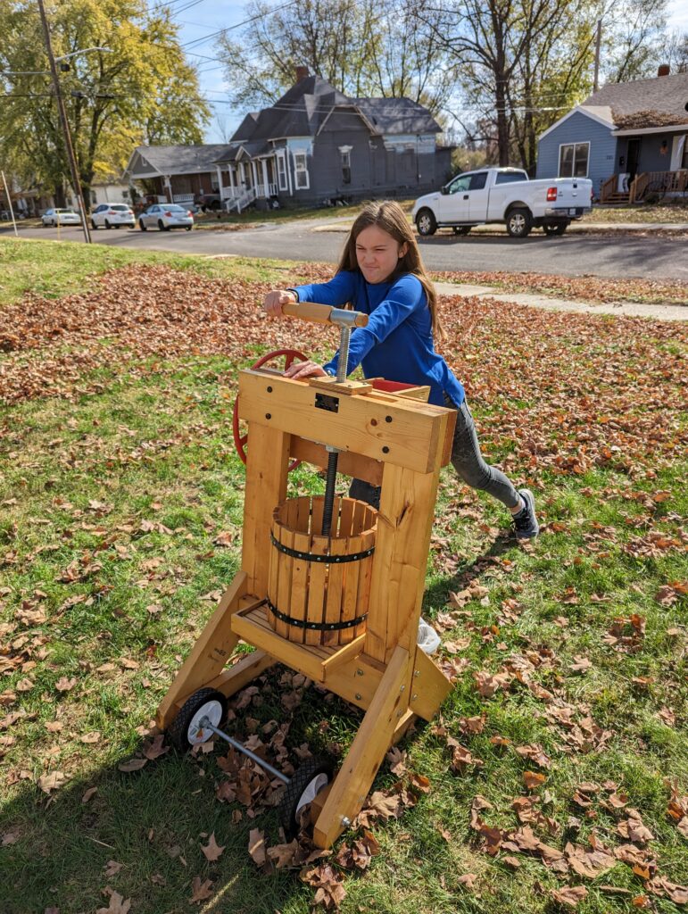 The press is always the challenging part, and the kids are amused in trying to crank it just a quarter turn further. The cider presses out, the apple pulp settles a bit, and usually you can crank it just a little bit more. After awhile, we sort of give up, but still keep the rest of the pulp to convert into apple cider vinegar (Brooke was pleased with how it turned out last year!).