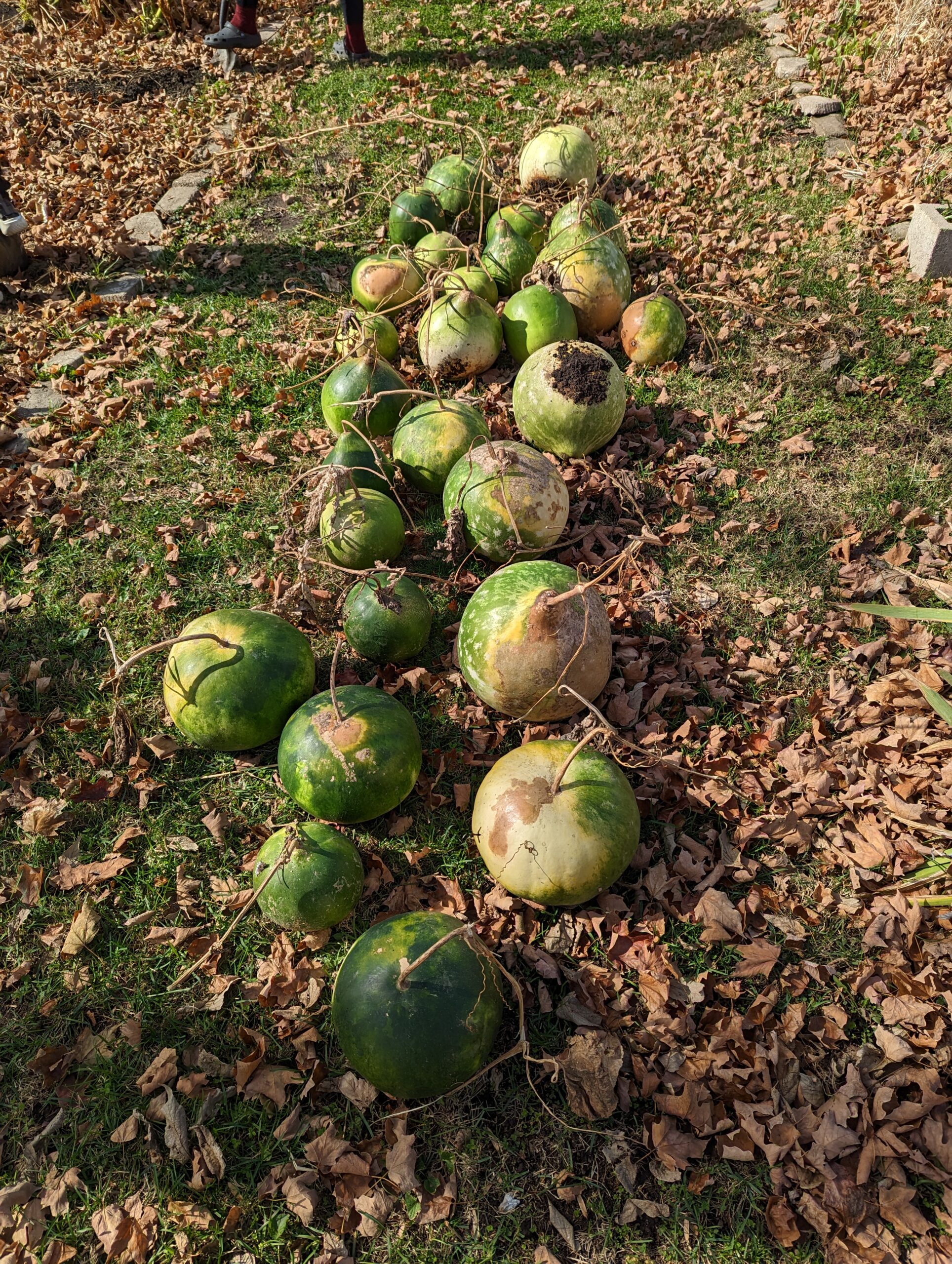 Separately from the cider work, Brooke also harvested her gourds. It still may take another 6 months before we can actually make bowls out of them. We’ve got to find a “cool, dry place” for them, which will have to be our basement, despite the fact that it’s only really “cool” and rarely ever “dry.” Still, we don’t have much of a choice of where to put them!