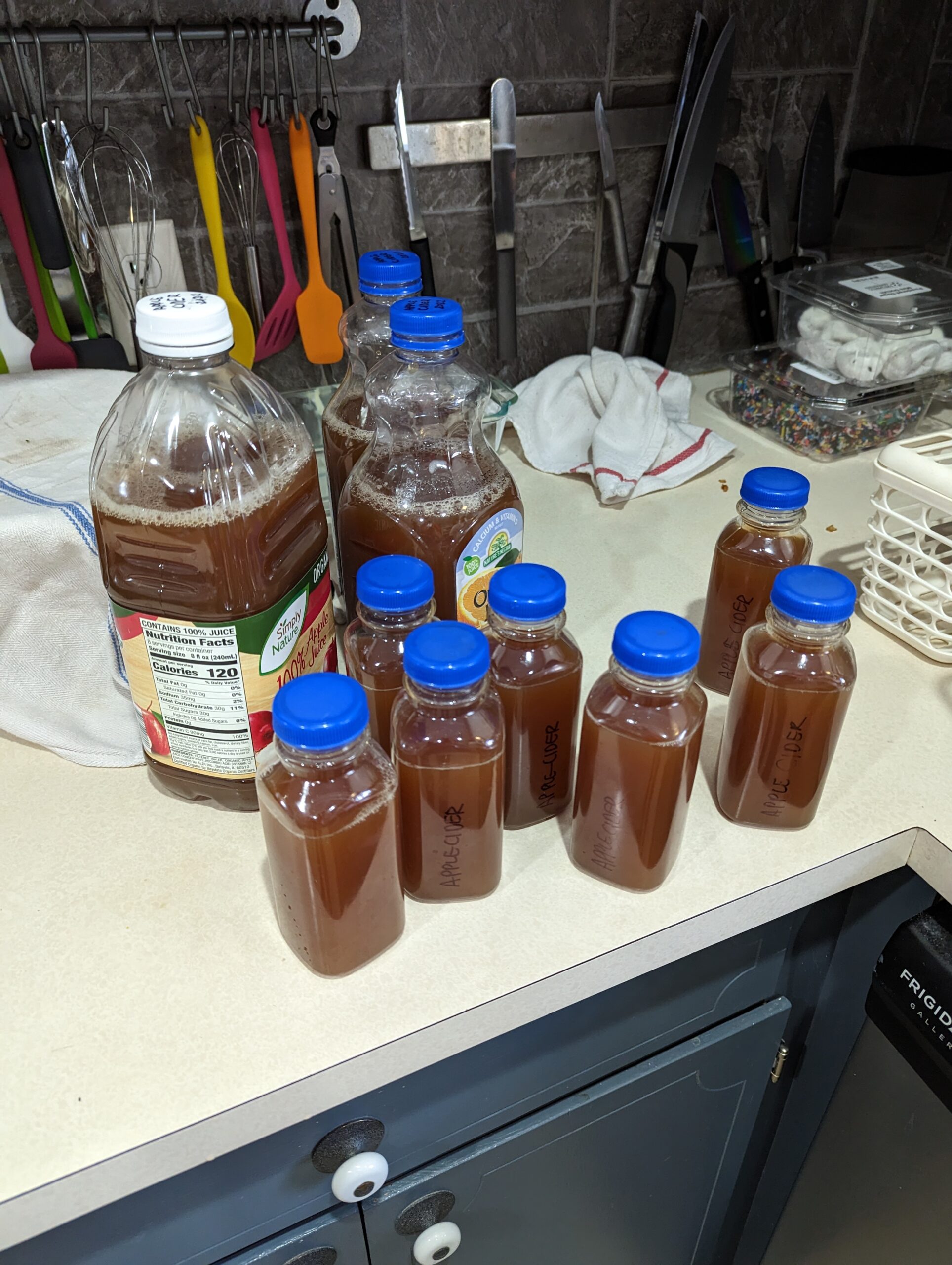 Ultimately, we ended up with a pretty good haul! The smaller bottles will go in the freezer for smaller volumes. Calvin likes heating up cider and putting a cinnamon stick in it, so this should make it easier for us to make it on a whim without thawing out a ton that’ll go to waste.