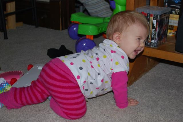 Last Wednesday night, Meg went to bed as she normally does: takes a milk bottle (8 oz, usually), goes to sleep within 15-20 min, and we are out of the room within 30 min. She woke up around 10:30 and had more milk, and had to be rocked to sleep again. If I remember correctly, she woke up again in the 1:00 hour and had to be rocked to sleep yet again.