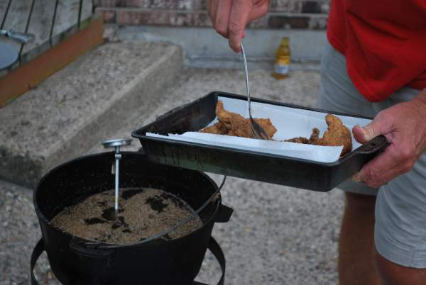 After he turned the burner down a bit, things improved. It only took a few minutes for each fish fillet to be cooked through. I was kind of amazed how the smell of fried fish permeated the air surrounding the frying rig. I mean, you can smell fried fish in a restaurant easily, but that’s an enclosed space. This was very easy to smell from 30 feet away. Mmmmm…