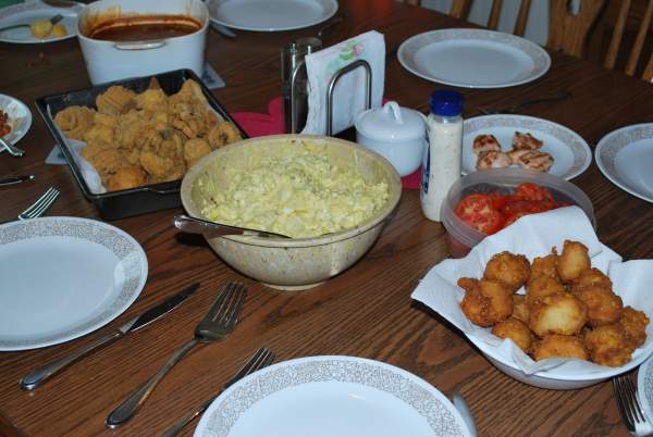 The final product: fish, hushpuppies, corn fritters, potato salad, tomatoes, baked beans, and a side of chicken for grandma.