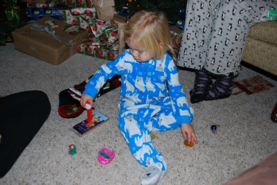 However, since we didn’t get home until 10:00 pm on Christmas Eve, Meg was quite content to stay in bed until 8:00 am the next morning, meaning we had to wake her up to get her to church on Christmas Day (thus, leaving Meg enough time to open one present before leaving). Still, it all worked out. Meg wanted to play with everything she opened immediately, rather than waiting until after everything was opened to choose something to play with. Perhaps it was better to only get one first.