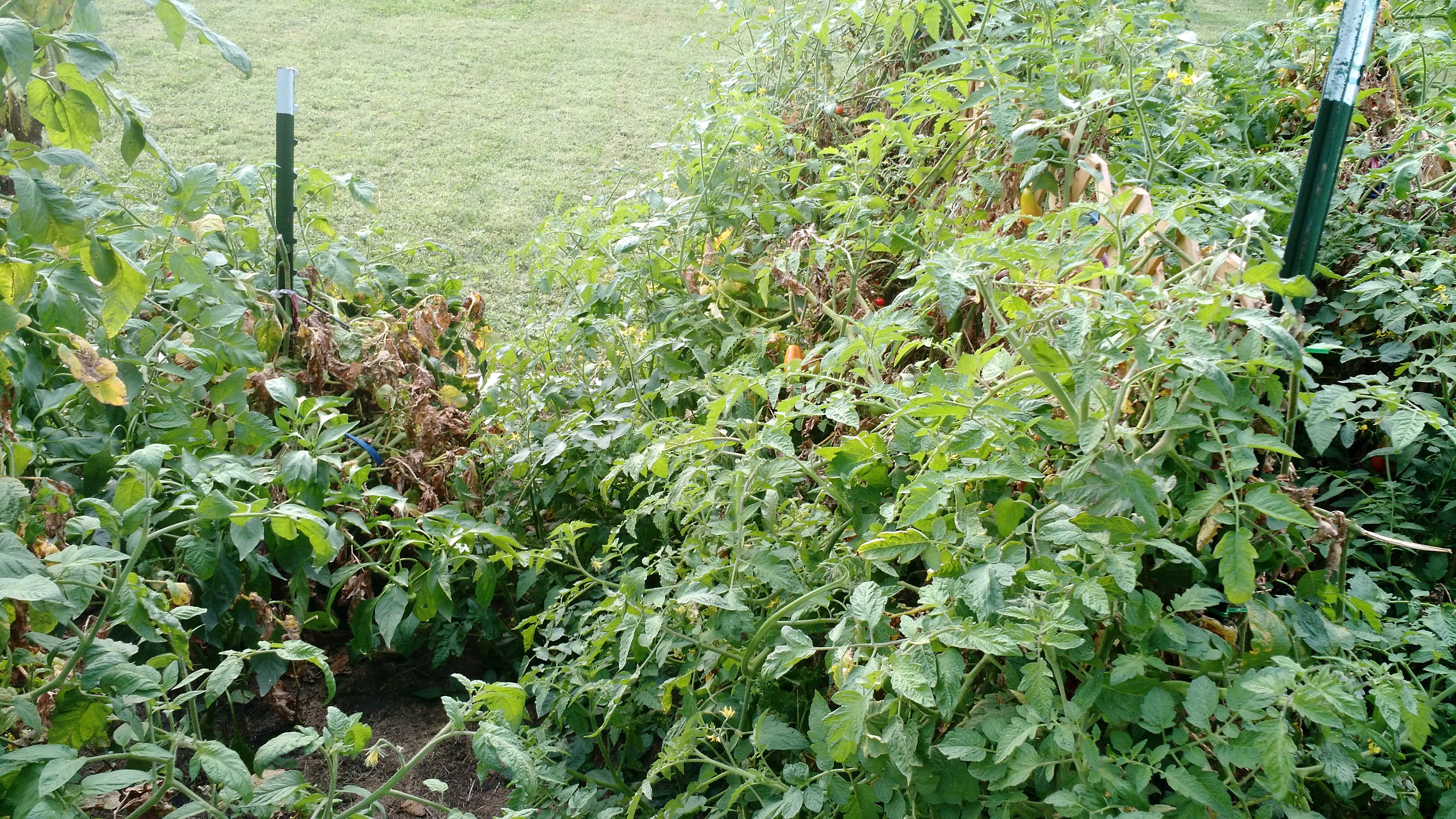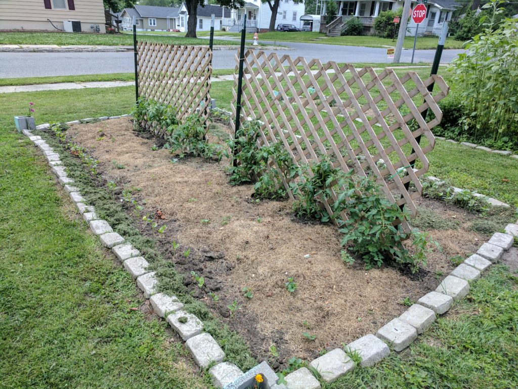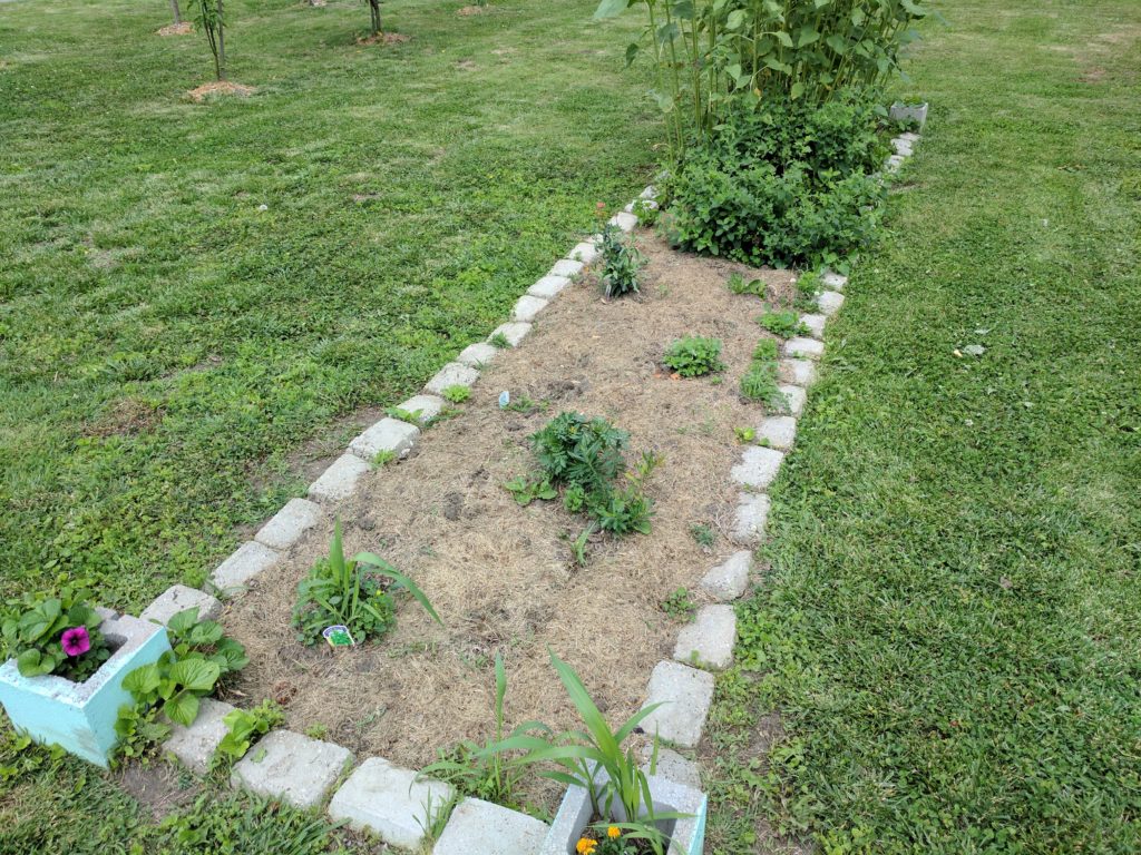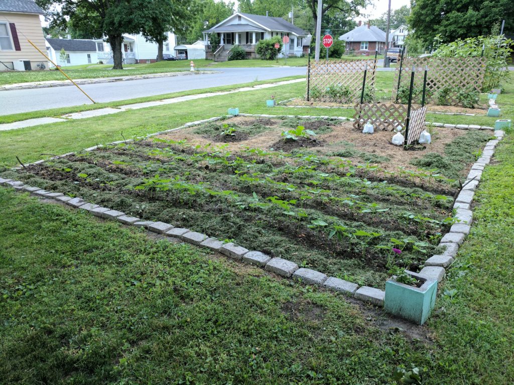The green beans, tomatoes, soup beans, pumpkins and watermelons are all moving along pretty well! There are some tiny green tomatoes on the plants and the green beans are flowering, so all’s well on that front. The green pepper plants are still pretty small: two of them are looking good, while the other two are on the short side, and are getting encroached by “volunteer” tomato plants from last year.