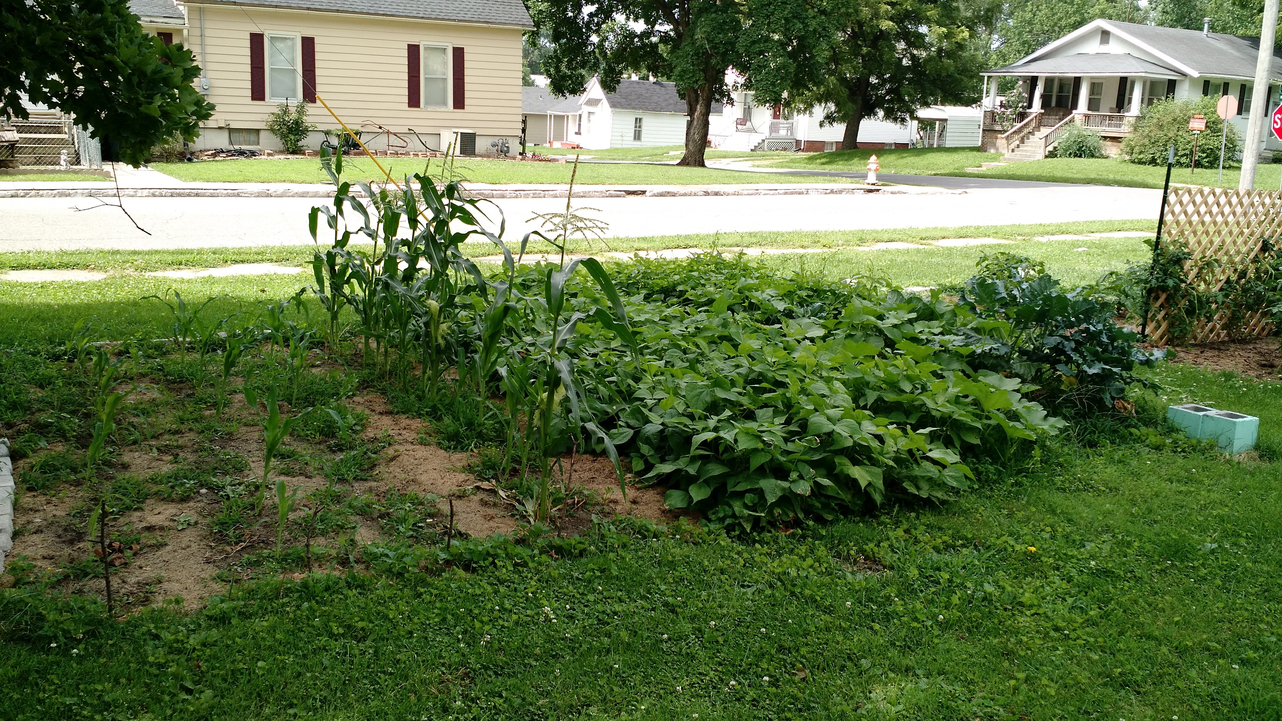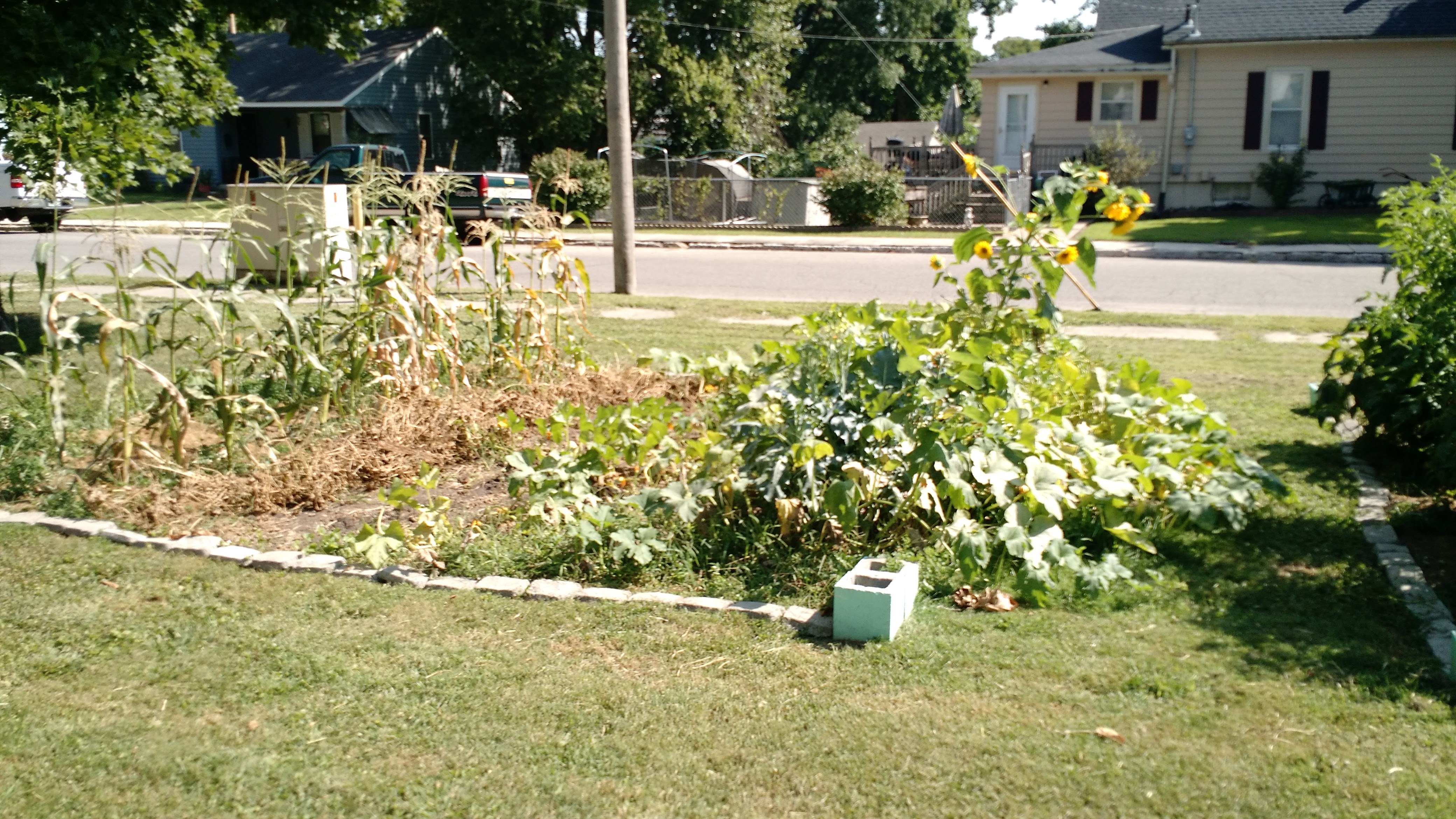 The main garden has looked like this for a few weeks now. Brooke pulled out the green beans a few weeks ago and the corn has been done for awhile (we ended up with 24 pint jars, a few quart-size bags we gave to others, and a decent amount we could eat on at dinner – not bad for a first year). We didn’t end up with much corn, sadly. Some of the ears were actually pretty good, while others were under-developed or pre-chewed by insects.