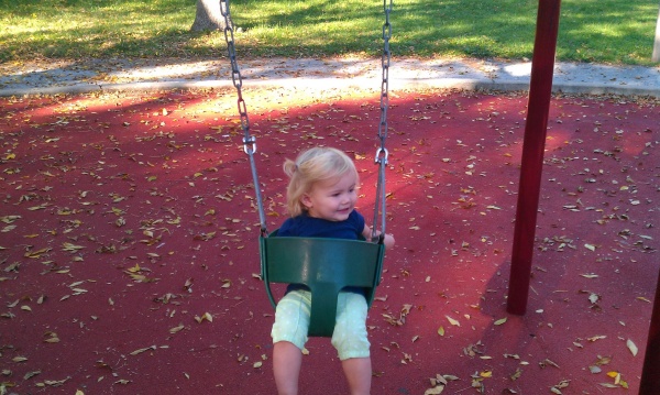 Thankfully, there’s a nice park very close to our house, well within walking distance.  There’s a playground, as well as benches, a field, and so on.  In general, a nice resource to have nearby, especially as we don’t have a really good place for her red swing.  Good thing the park has swings fit for Meg.  🙂