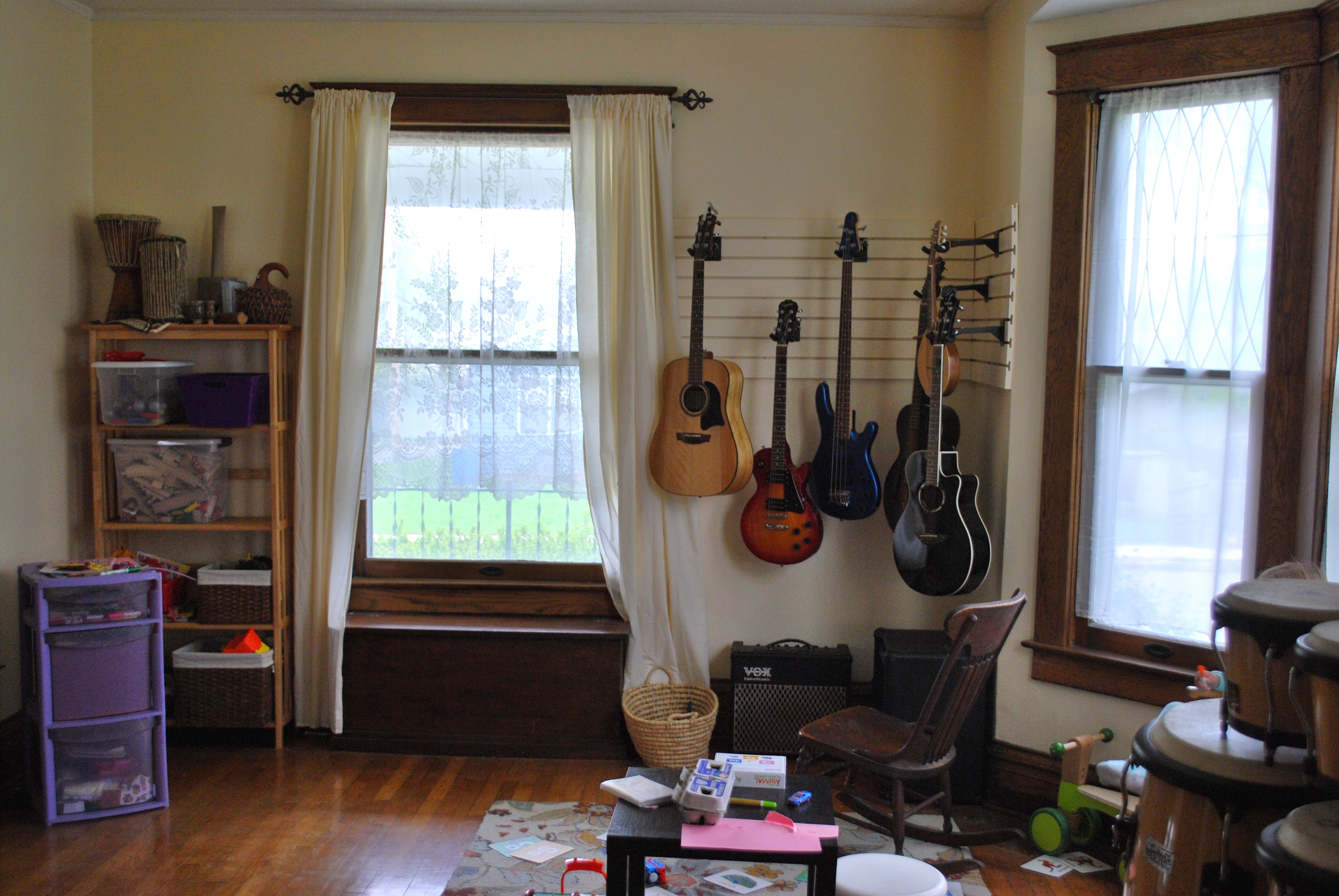 Here’s more of a “wide shot” of that section of the room, now with the sheer curtains over the bay windows, a bench Brooke picked up underneath the windows, the rug we used to have in the living room and moved into the music room, and the various instruments.