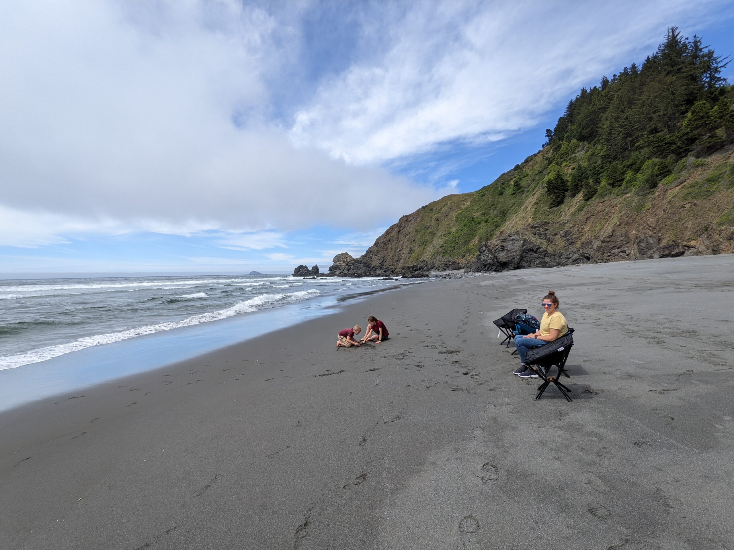 We drove for another 2 hours and stopped at a beach about an hour outside of our final destination. The house at Smith River wasn’t ready yet, so we stopped a beach near Myrtle Creek, OR to kill some time. We also started using our new Cliq folding chairs that Brooke found. I can’t get over how awesome these things are. We wanted something compact that we could take without sacrificing room in the car. Four of them fit in an approximately 6″x10″x20″ bag, which is nuts. Were they ridiculously expensive? Yes. Was it worth it? Also yes.