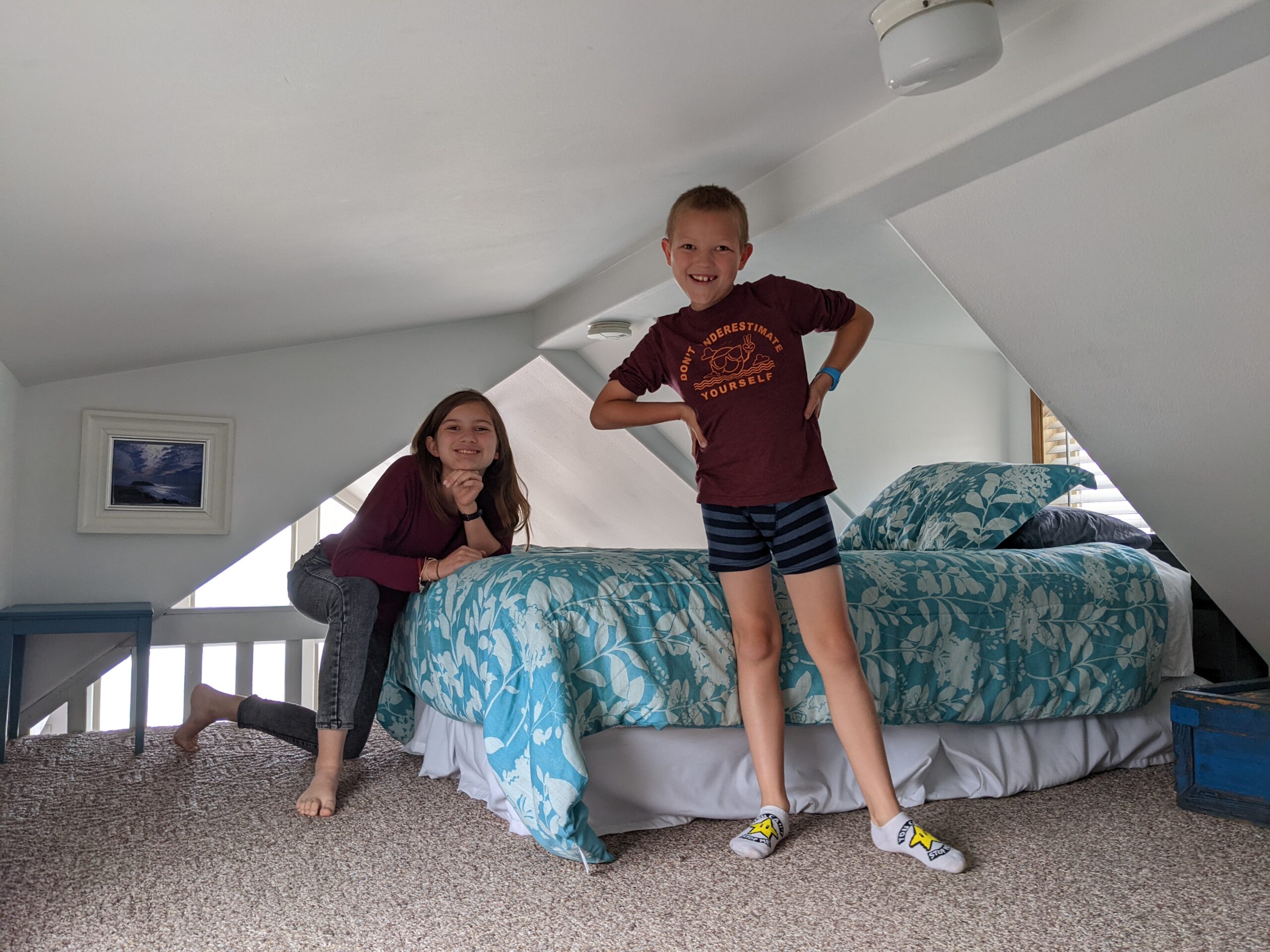 We made it to the house at Smith River by 6:30 that night. It’s something of a “resort cabin,” meaning the houses were all relatively close together and, because of that, they were all smaller than maybe we’d have preferred, but we got a room and the kids got a loft with two twin beds, so it was better than nothing.