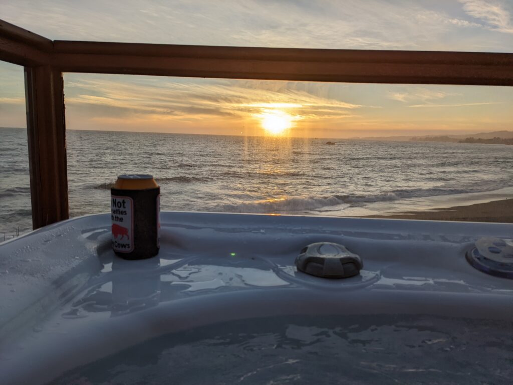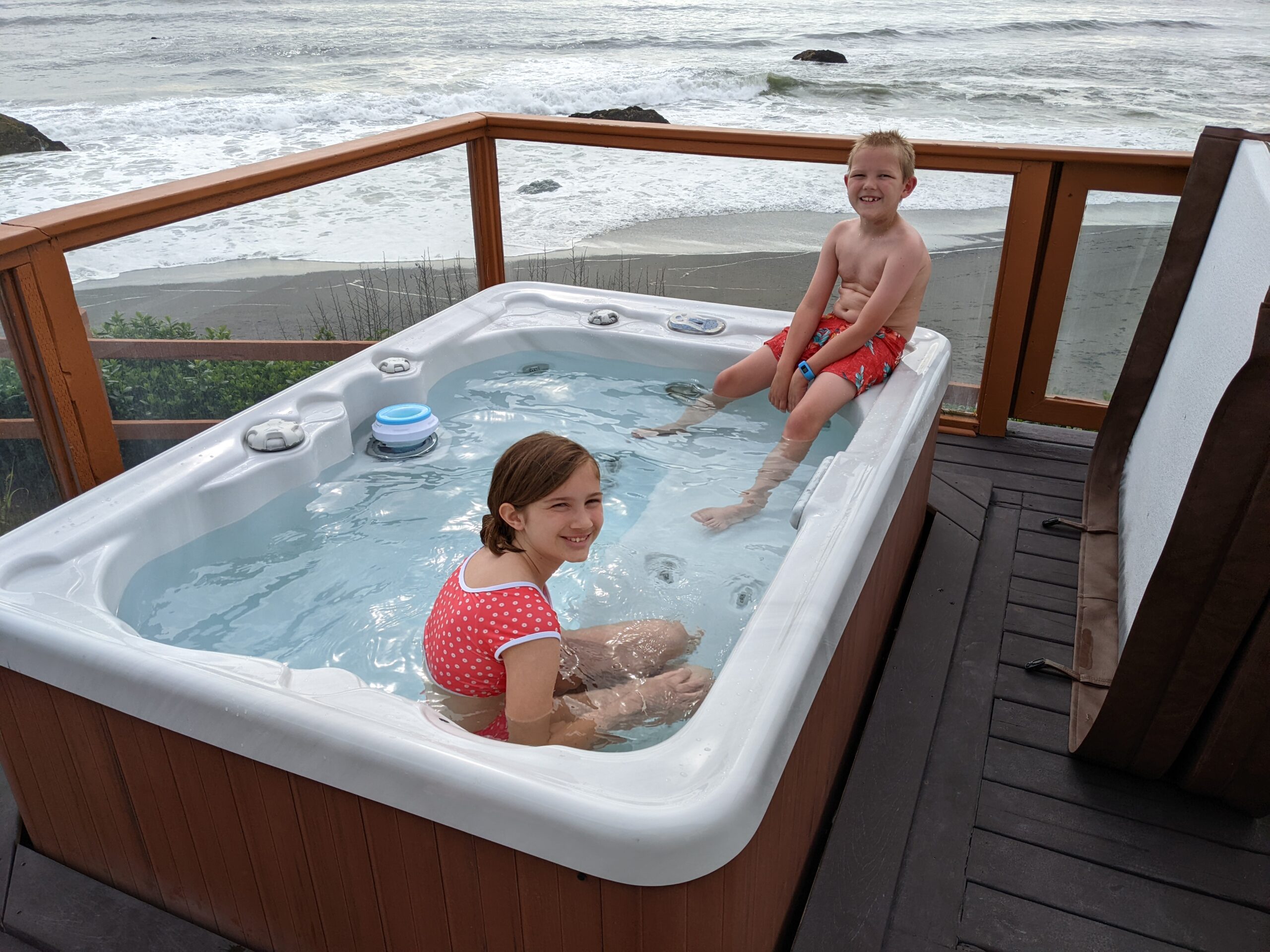 We got back home around 4:00 pm, so we went down to the beach for a bit, and then the kids came up and hopped in the hot tub. Again, the water is relatively cold and it was cloudier that day, so not particularly pleasant for swimming…