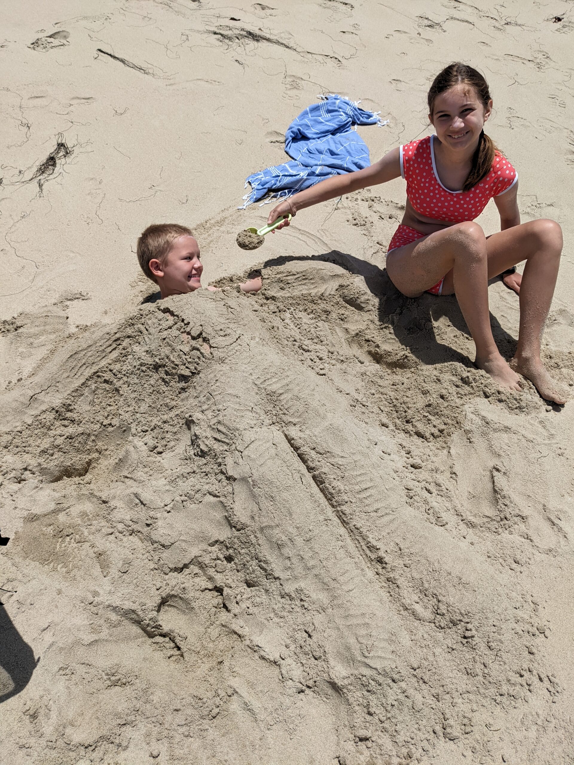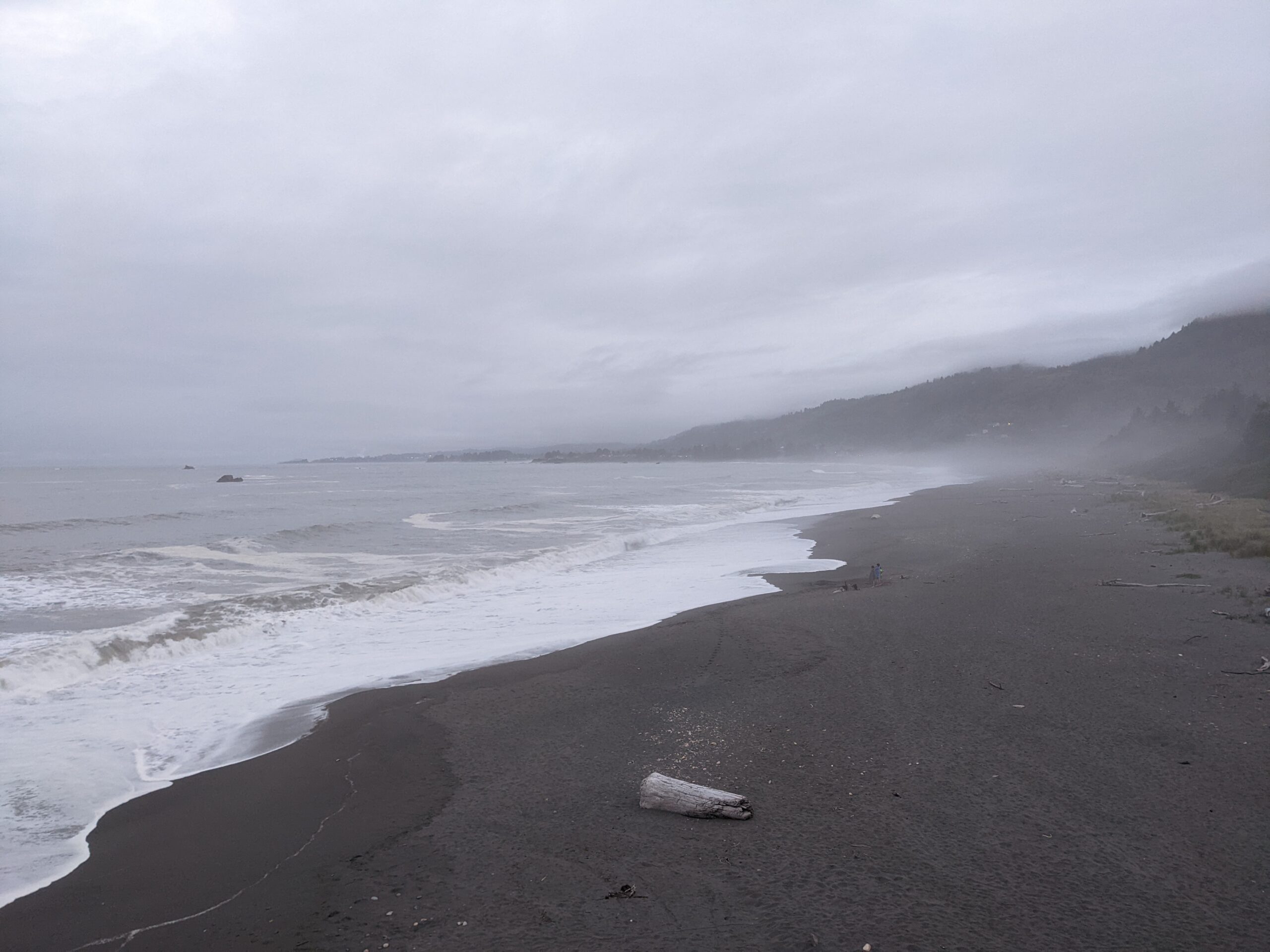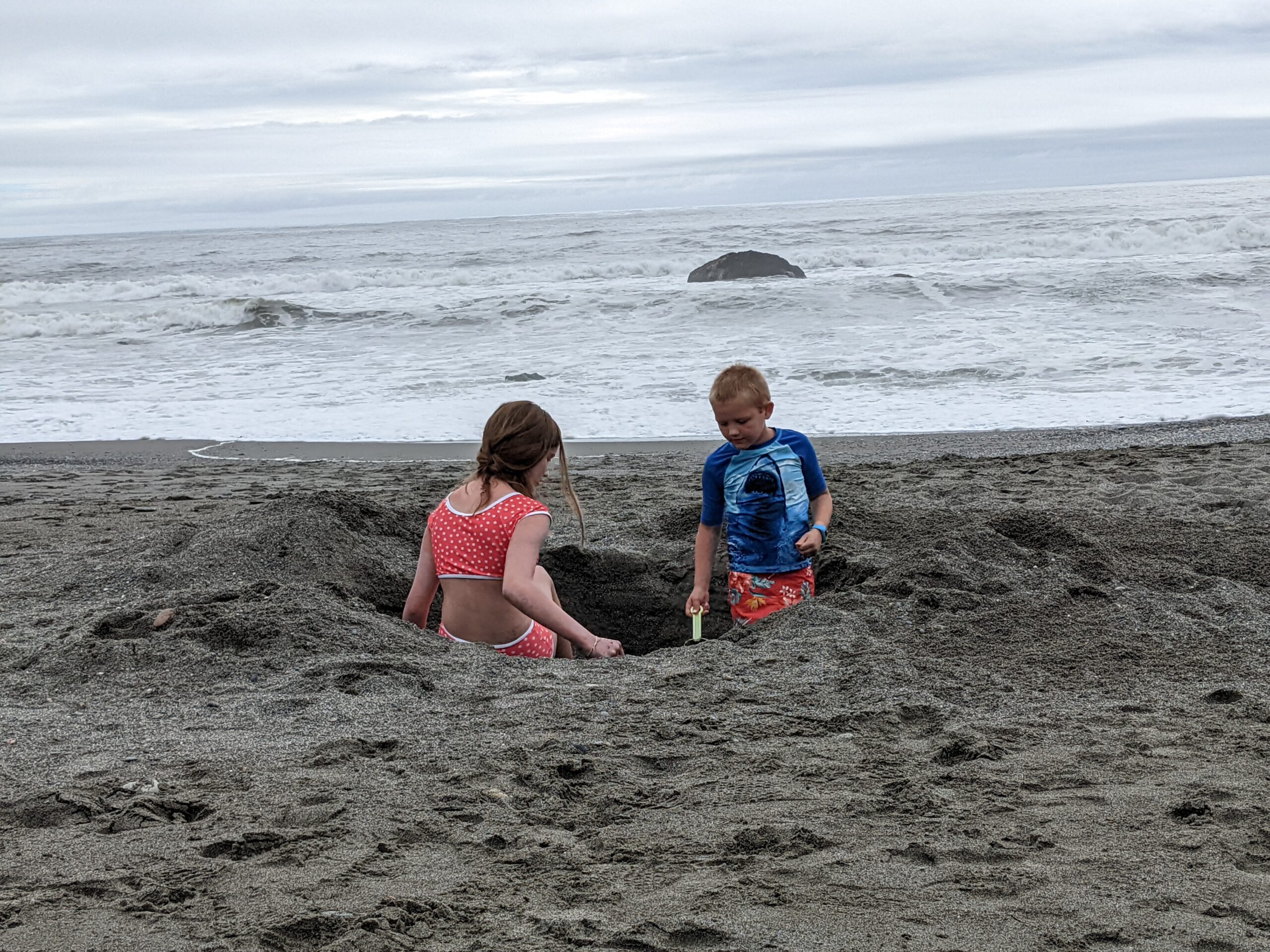 The next day wasn’t much better, but the kids were promised a “beach day,” so a “beach day” they would have! Really, the kids just worked on digging a hole, and spent nearly all day doing it. Brooke went up to find a laundromat in Brookings, OR, which was just across the state border, so I was down with the kids for part of the morning, and then Brooke took over for some of the afternoon when I took the car for a vacuum and car wash, and also check out a nearby liquor store to stock up on Northeastern US beers (nearly all IPAs, of course).