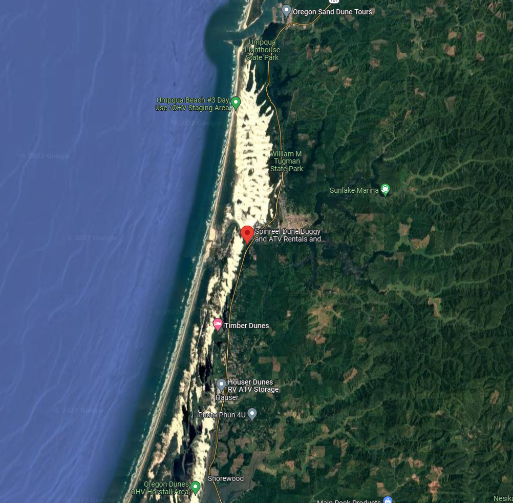 Brooke saw some rental locations in the book she was reading, I called one up, and they had a few slots available relatively early the next morning as we were heading down to Smith River! As you can see in the satellite image above, the dunes we went to are relatively large and give you access to the ocean (we went to Spinreel Dune Buggy and ATV Rentals), but we only wanted to commit an hour to this part of the trip. If we did a two hour rental (or longer), then we could have taken a buggy to the ocean and driven along it, but alas, not this trip. We went through a safety training video and had someone draw on a map where we should go with an hour to spend: if we went past the hour mark, we’d have to pay for another hour, so we didn’t want to go too far.