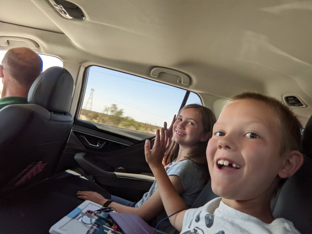 We ate lunch out of the back of the car (which was the intent – we borrowed Mom and Dad’s smaller, but good, cooler and tried to pare down what we’d actually eat and what we actually needed to keep cold). A brief aside, we used the cartop carrier, as always, but Brooke had us all pack as light as we could, so shockingly, we were able to see out of the back of the car nearly the entire time! This is a first for us.