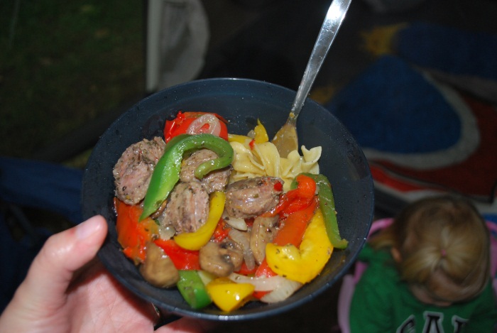 First night of vacation: foil packets with Italian sausage, peppers, onions, and mushrooms. Served with egg noodles. It was raining all evening, so I was glad we didn’t really have to tend this meal too closely!